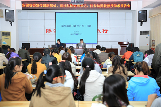 在参加研讨会期间,陆勤毅院长还受邀在淮北师范大学做题为《新型城镇化建设的若干问题》学术报告会。他认为,新型城镇化建设是未来我国社会发展的重要引擎,是实现城乡一体化的重要途径,也是落实科学发展观的重要举措。安徽省近年来城镇化建设取得了积极成果,城镇化率明显提高,中心城市初步形成,城市群初见端倪,城镇化发展规划思路更为清晰。同时他对我国及我省城镇化过程中存在的主要问题进行了深入剖析,提出了解决问题的对策性意见和建议。在报告会互动环节,陆勤毅教授与参会的师生关注的淮北城镇发展的趋势,新型城镇发展为大学生就业带来的契机等问题进行了深入交流,受到师生们热烈欢迎。