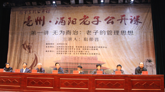 11月6日上午,亳州•涡阳老子公开课开课仪式在涡阳大剧院举行。省委宣传部副部长、我院党组书记、院长陆勤毅出席开课仪式并作重要讲话。亳州市委常委、宣传部长杜爱玉主持启动仪式,并和涡阳县党政干部、研老专家、中小学校长、中小学语文教师、国有企业负责人及县直部分单位干群1000余人共同听取了讲座。中国人民大学哲学院教授葛荣晋以《无为而治:老子的管理思想》为题进行首场专题授课,重点阐述了老子思想在现代政府管理、社会管理和企业管理中的重要现实意义。