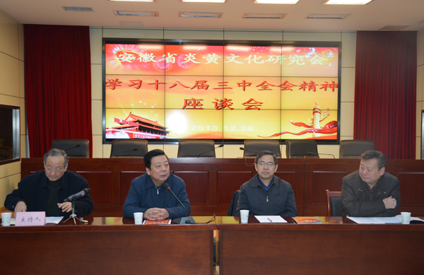 2013年12月26日,安徽省炎黄文化研究会学习十八届三中全会精神座谈会在我院召开,来自全省各地的专家学者50余人参加了会议。省政协原副主席郑牧民出席会议并作重要讲话。省委宣传部副部长、我院党组书记、院长陆勤毅教授,代表我院对来自全省各地的专家学者表示热烈的欢迎,并结合党的十八届三中全会《决定》就提高文化开放水平,扩大对外文化交流,加强国际传播能力和对外话语体系建设,推动中华文化走向世界等进行了重点阐释,强调指出应从加强总体设计、拓展平台渠道、生产出符合世界各国需要的文化产品、培养专业人才等方面加快推动中华文化不断走向世界。省社会科学界联合会副主席洪永平到会表示祝贺。会议由研究会副会长、省委讲师团原团长李抗美主持。