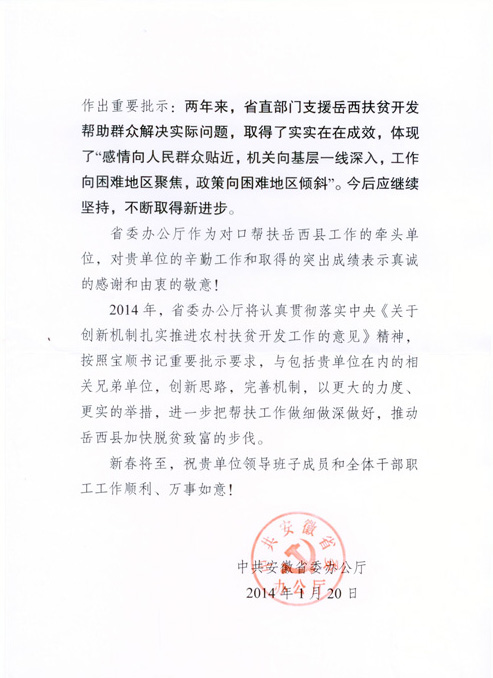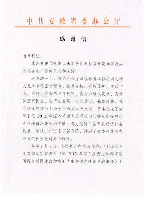 省委办公厅近日向我院发来感谢信,对我院长期以来为省委对口帮扶县岳西县扶贫开发作出的工作和取得的成绩表示真诚的感谢和由衷的敬意。