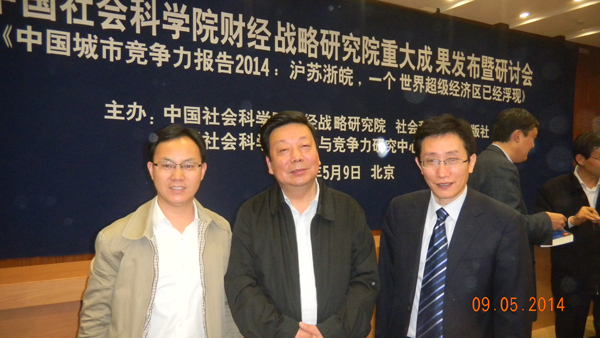 5月9日,“中国社会科学院财经战略研究院重大成果《中国城市竞争力报告2014:沪苏浙皖,一个世界超级经济区已经浮现》发布暨研讨会”在中国社科院学术会堂举行,安徽省委宣传部副部长、我院院长陆勤毅和院当代安徽研究所所长邢军应邀出席。会议由社会科学文献出版社社长谢寿光主持,倪鹏飞研究员、李超博士、李冕博士等代表课题组对研究成果进行介绍。中国社会科学院副院长、学部委员李培林,国务院参事、第三世界科学院院士、中国科学院研究员牛文元,中国社会科学院财经院院长、学部委员高培勇,国务院发展研究中心局长李善同,中国城市规划研究设计院总规划师张兵、江苏省社科联主席张颢瀚等专家学者以及新闻出版、媒体代表30余人出席会议。