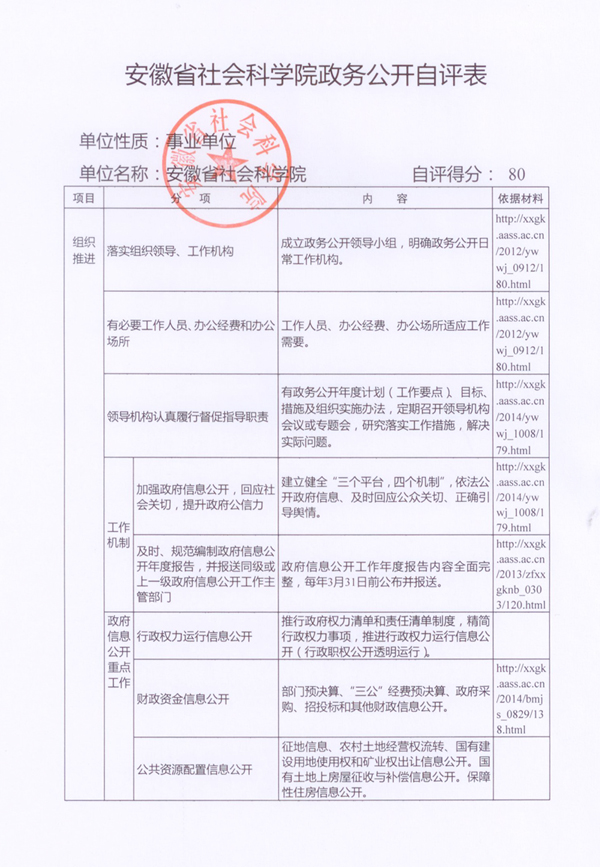 【工作推进】安徽省社会科学院政务公开自评表