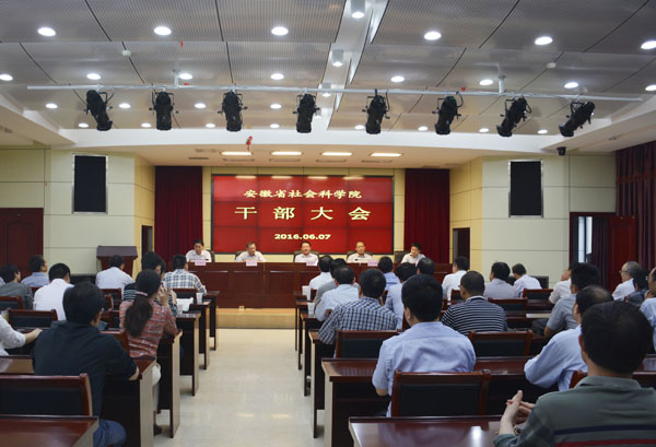 6月7日上午,我院召开干部大会。省委宣传部常务副部长虞爱华同志出席大会并作重要讲话。院党组书记、院长朱士群同志主持会议。省委组织部企事业干部处处长魏发斌同志宣读省委省政府关于安徽省社会科学院党组书记、院长的任免决定。朱士群同志、刘飞跃同志分别发言。院党组成员、院副处副研以上干部及省委宣传部干部处负责同志参加会议。