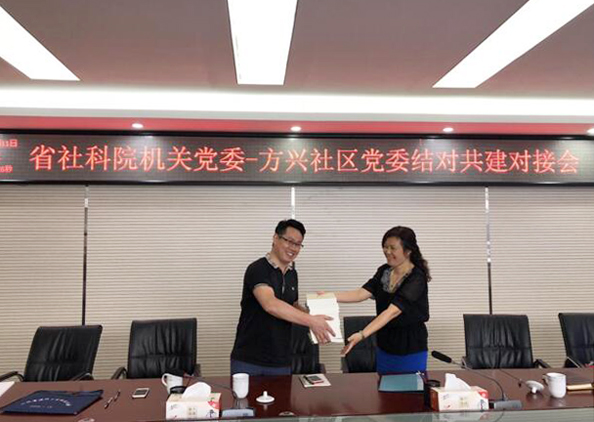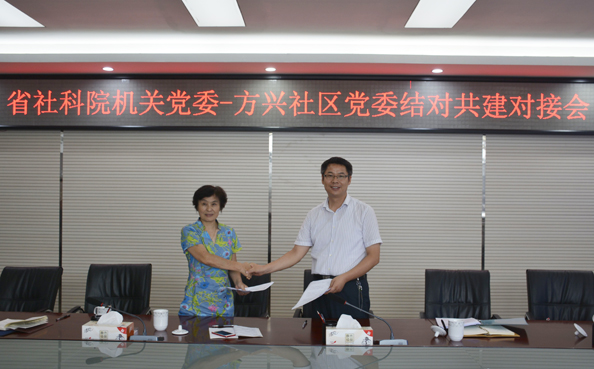 陆训和沈先财分别代表各自单位在党建和精神文明建设结对共建协议书上签字。院机关党委副书记王磊代表省社科院机关党委向方兴社区赠送了图书。