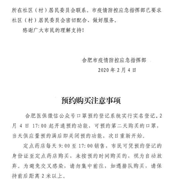 合肥市防控指挥部公告(关于口罩购买问题)