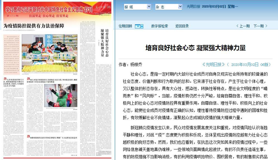 院中特基地围绕习近平总书记关于疫情防控重要讲话精神和中央、省委有关决策部署深入开展理论研究和阐释解读,其中3篇先后以院中特基地名义发表于《光明日报》。孔令刚研究员撰写的《为中小企业发展提振信心》为中小企业的发展提出切实可行、有针对性的政策建议,为共同战“疫”坚定了必胜信念;杨根乔研究员撰写的《培育良好社会心态 凝聚强大精神力量》着重阐述了当前如何培育自尊自信、理性平和、积极向上的良好社会心态及其重要意义,切实引导广大人民群众增强战胜疫情的坚定信心;钱念孙研究员撰写的《春天,从枝头移到心头》在头版刊发,文章以散文化的笔触记录了疫情发生以来全国上下众志成城共克时艰的伟大历程,指出“春天已不只在枝头绽放,也在人们心头融化冰雪,点燃希望”,“伟大的中华民族将如凤凰涅槃,展现更加雄姿勃发的生机”。
