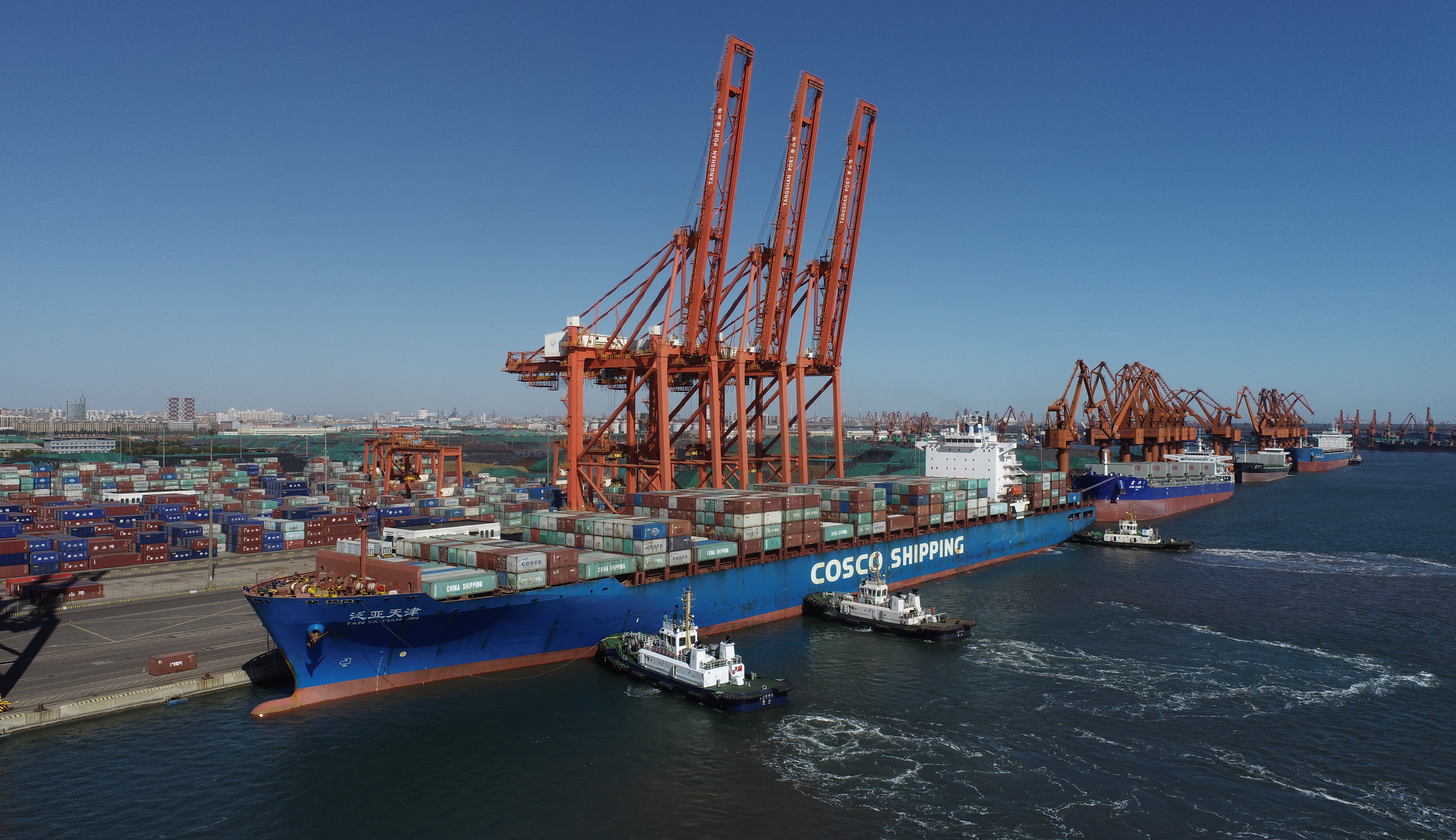 10月23日,一艘轮船在拖轮的协助下向唐山港京唐港区集装箱码头靠泊(无人机照片)。新华社记者 朱旭东 摄