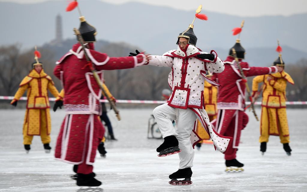 在北京颐和园冰场举办的还原清朝八旗官兵冰嬉活动的表演(2018年1月21日摄)。新华社记者 李俊东 摄