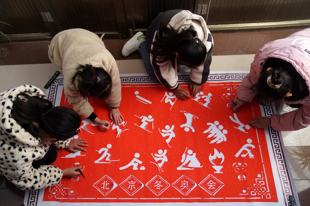 农历壬寅年到来之际,在河北省临城县东镇镇南孟村,村民围绕“迎冬奥”主题剪纸。新华社发(陈雷摄)