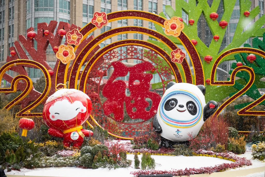 2022年1月20日大寒时节,北京冬奥会“冰墩墩”和冬残奥会吉祥物“雪容融”景观在北京东单路口增添节日的喜庆气氛。新华社记者 陈钟昊 摄