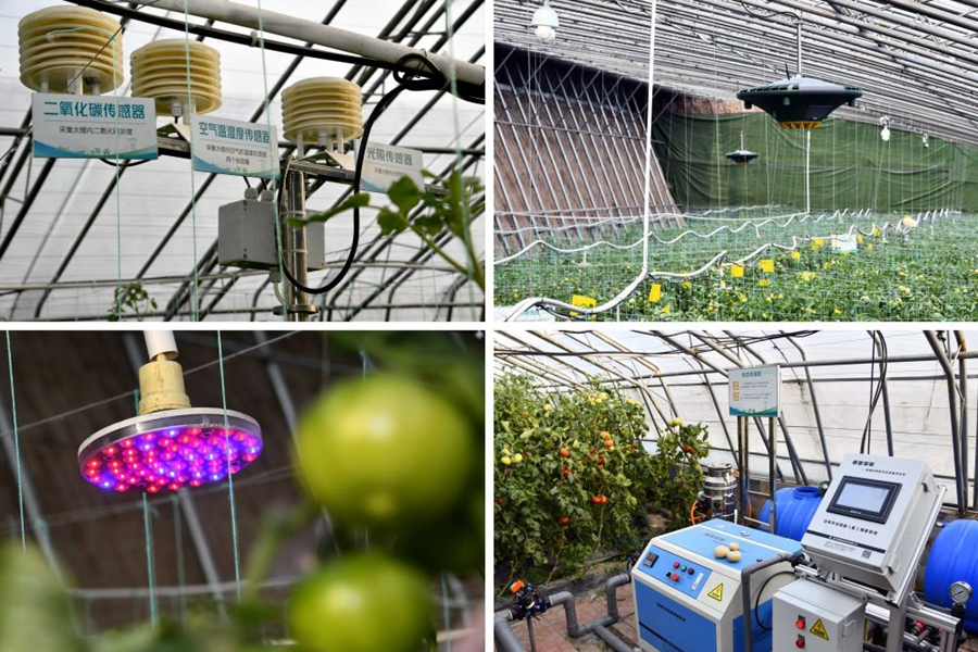 ↑这是在山东省寿光市现代农业高新技术试验示范基地拍摄的AI智慧大棚内景。左上为传感器设备;右上为多功能植保机;左下为补光灯;右下为电动喷淋机(2020年4月21日摄)。