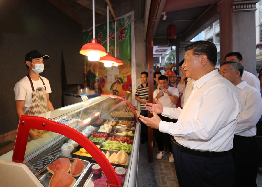 ↑2020年10月12日至13日,习近平在广东考察。这是13日下午,习近平在汕头市小公园开埠区,同商铺店员亲切交流,了解复商复市和常态化疫情防控情况。