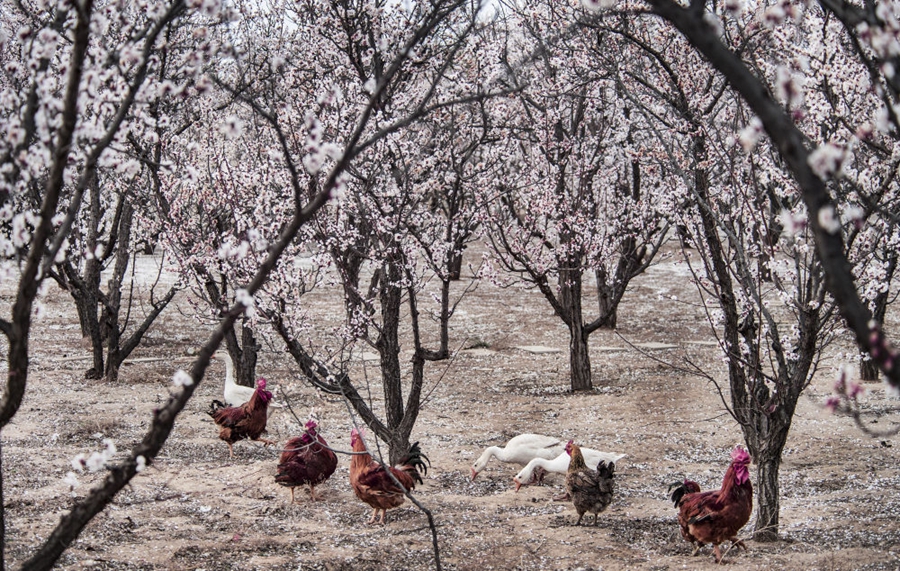 ↑一群鸡鹅在陕西省榆林市榆阳区古塔镇赵家茆村的杏树林里觅食(2020年4月7日摄)。当地群众在发展杏产业的同时发展林下经济,成效显著。