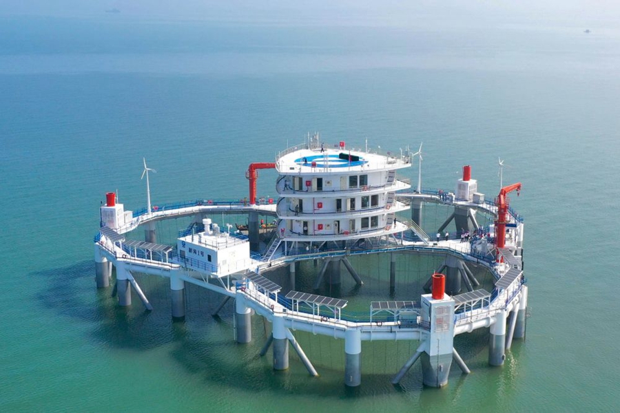 ↑“耕海1号”海洋牧场综合体平台位于山东省烟台市渔人码头以东海域,是我国首座大型智能化海洋牧场综合体平台,于2020年7月投运,每年可养殖优质海水鱼类20万尾,年产量约15万公斤(2020年7月10日摄)。