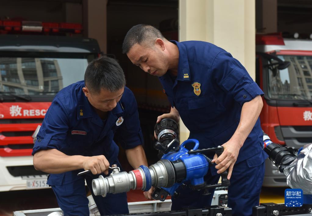 在江西省南昌市消防救援支队特勤大队营院内,李胜利(右)在检查装备器材(2020年10月8日摄)。新华社发(熊超 摄)