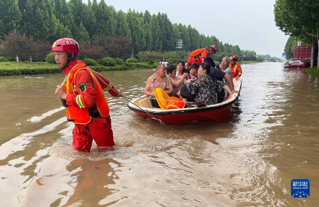 在河南省郑州市中牟县,李胜利(右一)在疏散被困群众(2021年7月22日摄)。新华社发(田聪 摄)