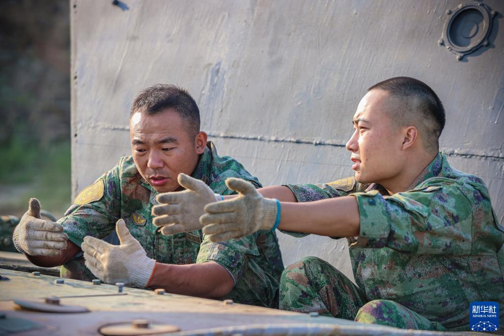 陆军第71集团军某旅“济南英雄连”连长孙金龙(左)向步战车驾驶员请教专业知识(2022年9月18日摄)。新华社发(黄振宇 摄)