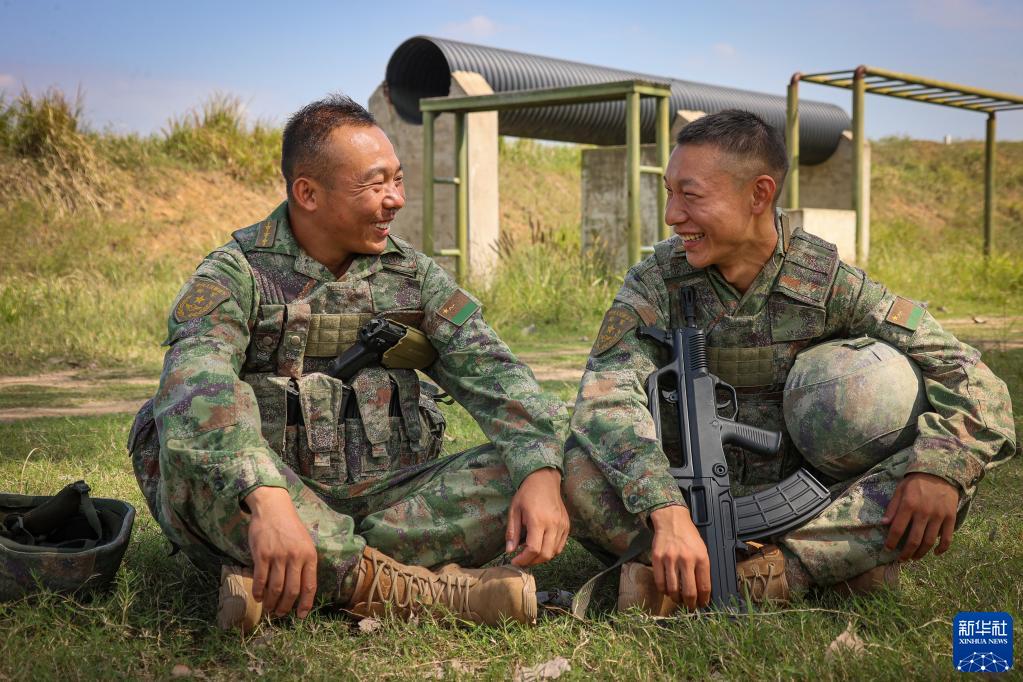 陆军第71集团军某旅“济南英雄连”连长孙金龙(左)在训练结束后与战士谈心(2022年9月22日摄)。新华社发(黄振宇 摄)